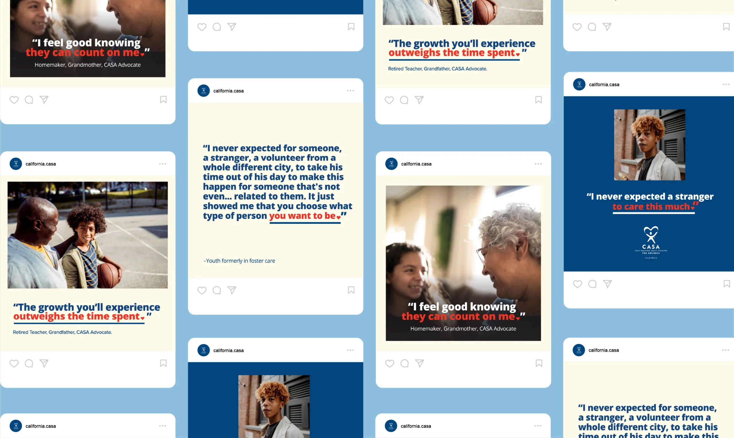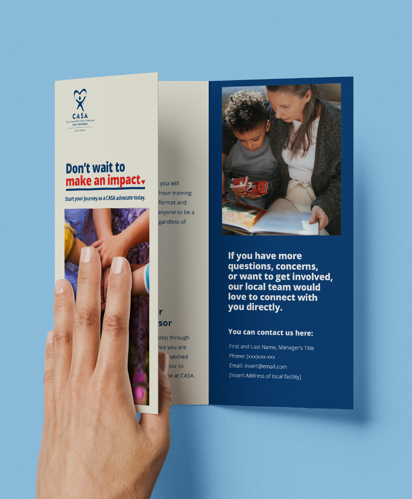 From those insights, we built a toolkit with three simple steps: Resonate, Inform, Guide. Ready-to-use print pieces, social posts, and email templates gave local CASA programs what they needed to keep conversations moving and grounded in trust across every touchpoint.